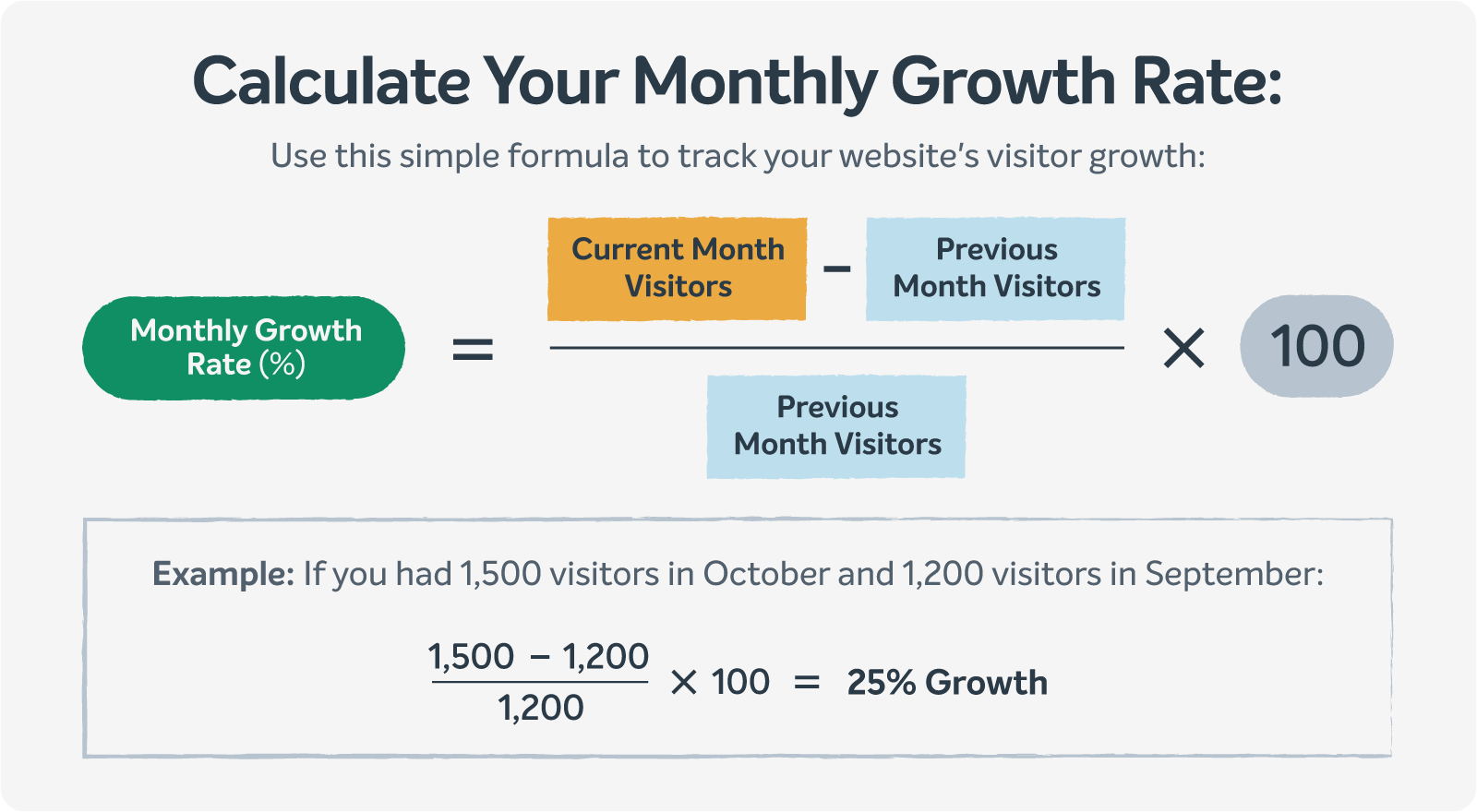For new websites, patience is essential. Most successful sites start with fewer than 100 monthly visitors in their first month and gradually build their audience through consistent effort. A realistic first-year progression starts with just a few dozen visitors per month, and builds from there. For example, your initial benchmarks might look something like this: